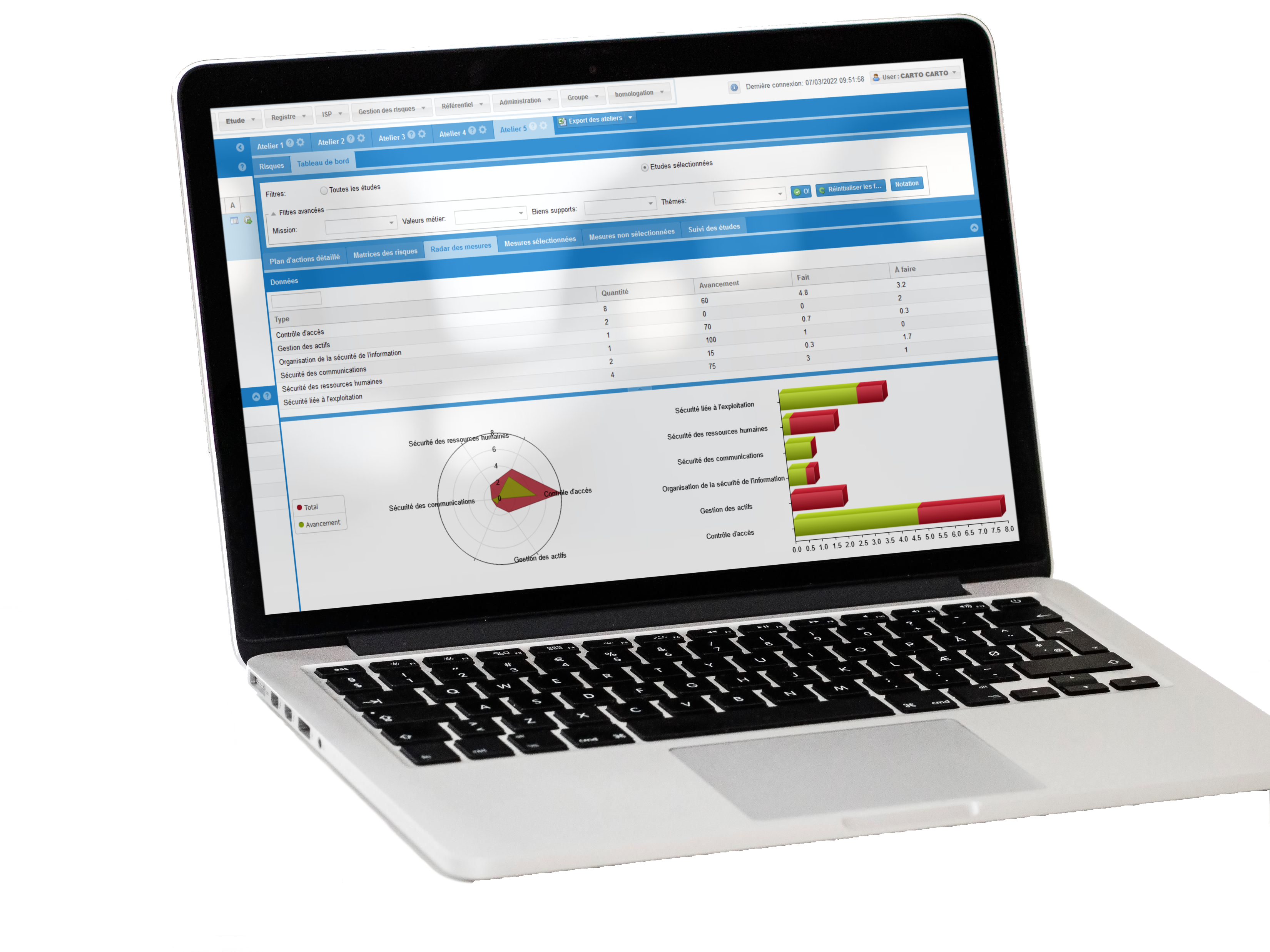 A Grâce à l’hébergement en mode Software as a Service (SaaS), vous accédez où et quand vous voulez à vos données et analyses, 24h/24 – 7h/7, via une simple page web et depuis n’importe quel navigateur. Vos analyses de risques sont toujours disponibles et vous bénéficiez de toutes nos mises à jour et ajouts de fonctionnalités.